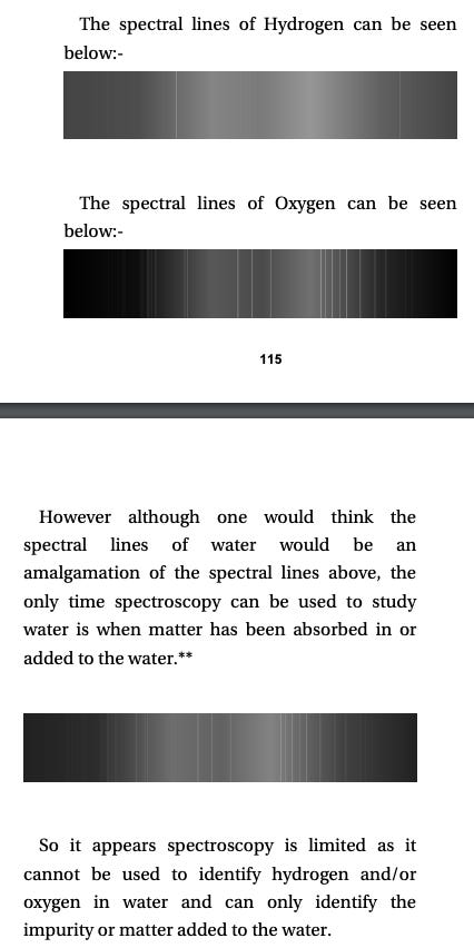 Spectroscopy identifies additives in water, not inherent H/ O.