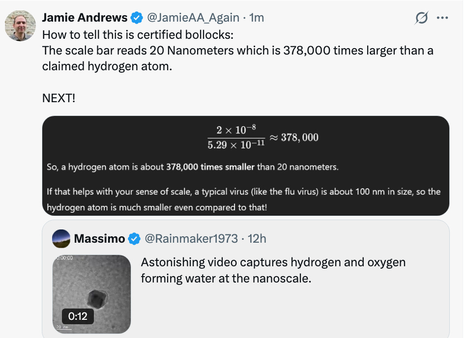 High-voltage “electrolysis” videos deceptive (show only initial bubbles; later electrode decomposition).