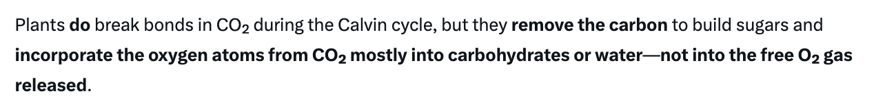 Photosynthesis is essentially a splitting process. Plants take the carbon from CO₂ to make sugars and release oxygen from it. That’s it!