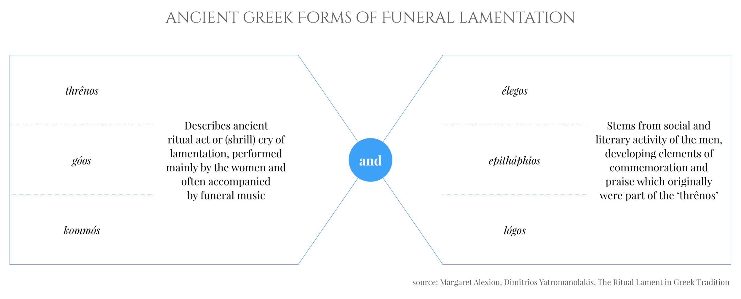 Thrênos and góos are both words of ancient Indo-European origin, referring to a shrill cry. However, over time it was the latter that was clearly associated with the spontaneous, unrestrained and highly individualised ecstatic performance of the women. Thrênos on the other hand began to be used for the set dirge of the man, often accompanied by music, solemn and calm in tone, composed and rhetorically polished in performance (Alexiou, p.102/103).