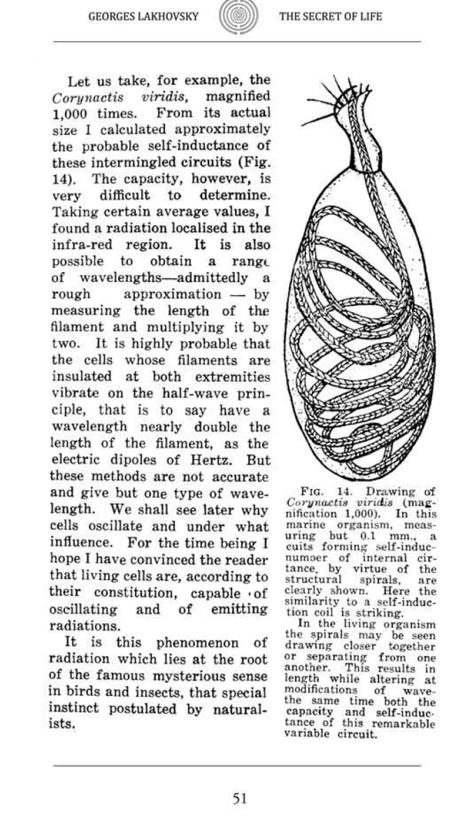 Georges Lakjovsky’s book the secret of life (1939) is very important, because it described the coiled filaments as radiating elements. This was before the hoax of the double helix that crick and watson introduced and even before Hudgkin and Huxleys discovery of the ion channel communication: