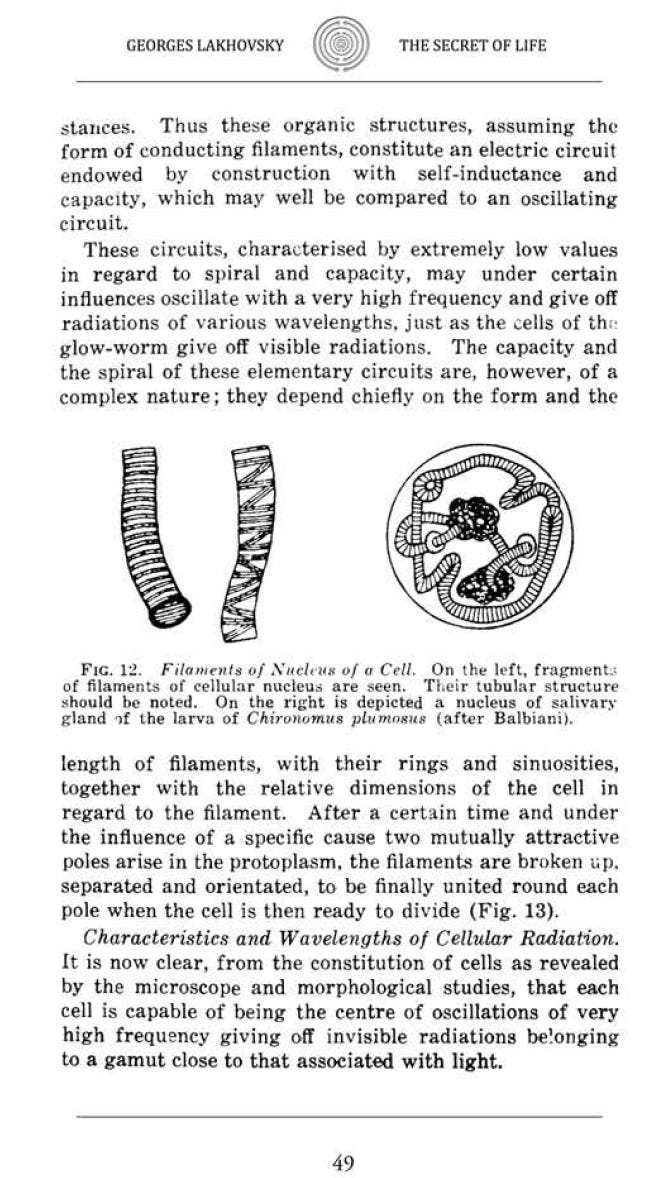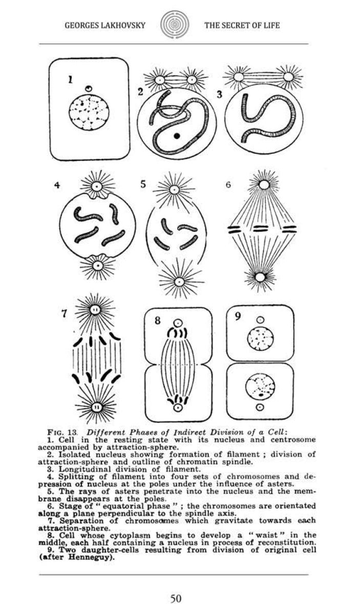 These circuits, characterised by extremely low values in regard to spiral and capacity, may under certain influences oscillate with a very high frequency and give off radiations of various wavelengths, just as the cells of the glow worm give off visible radiations. The capacity and the spiral of these elementary circuits are, however, of a complex nature; they depend chiefly on the form and the length of filaments, with their rings and sinuosities, together with the relative dimensions of the cell in regard to the filament. After a certain time and under the influence of a specific cause two mutually attractive poles arise in the protoplasm. the filaments are broken up. separated and orientated, to be finally united round each pole when the cell is then ready to divide .”