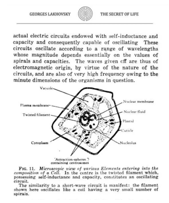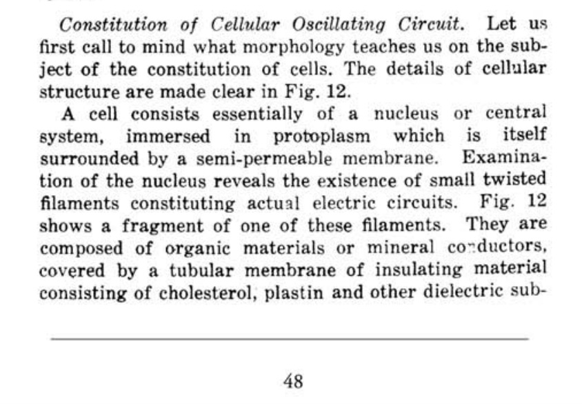 “They are composed of organic materials or mineral conductors, covered by a tubular membrane of insulating material consisting of cholesterol, plastin and other dielectric substances. Thus these organic structures, assuming the form of eonducting filaments, constitute an electric circuit endowed by construction with self-inductance and capacity, which may well be compared to an oscillating circuit.